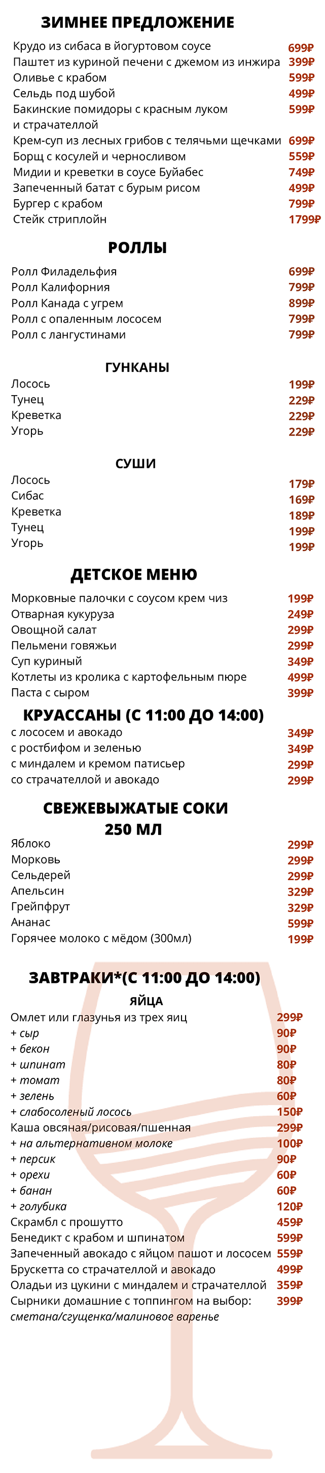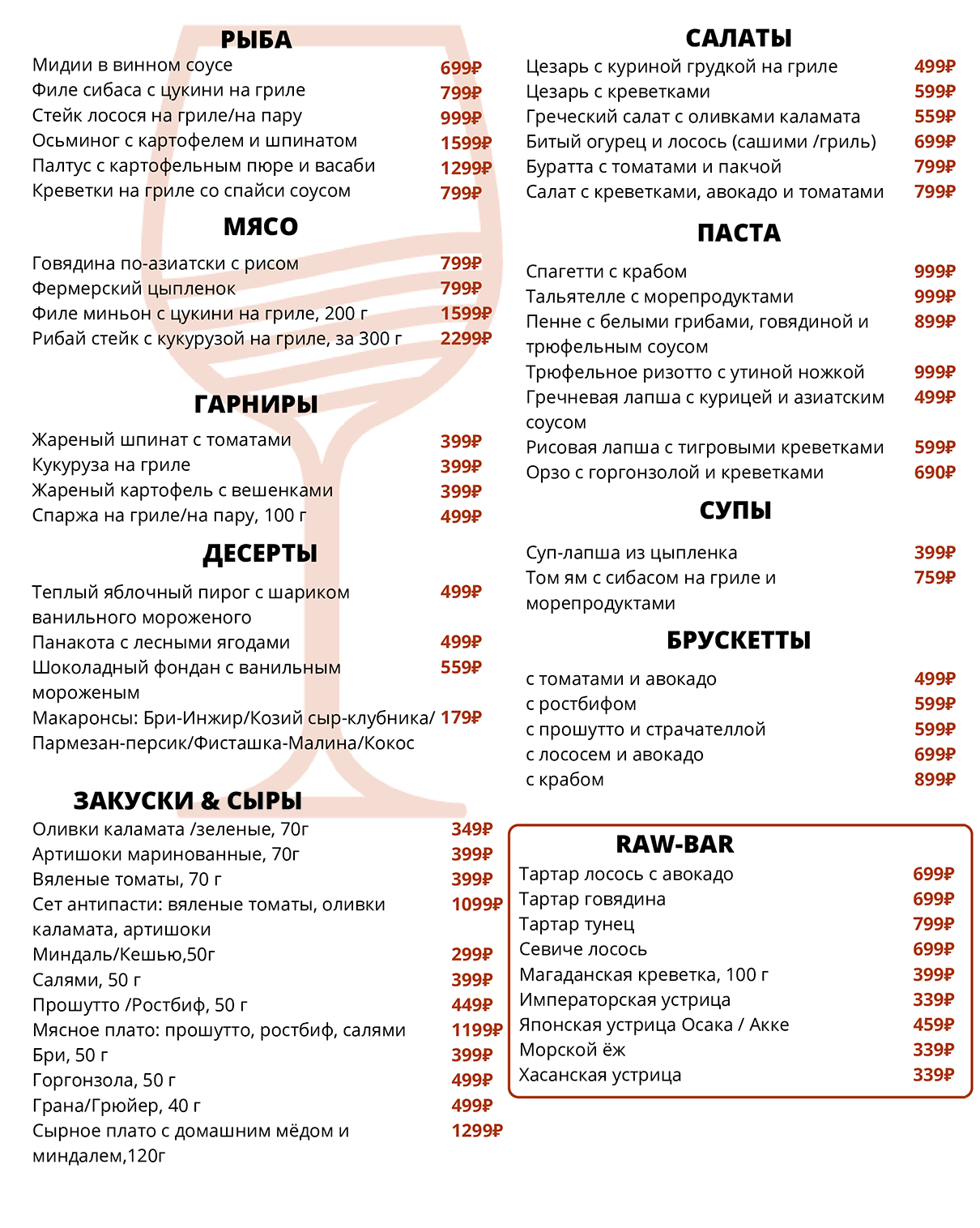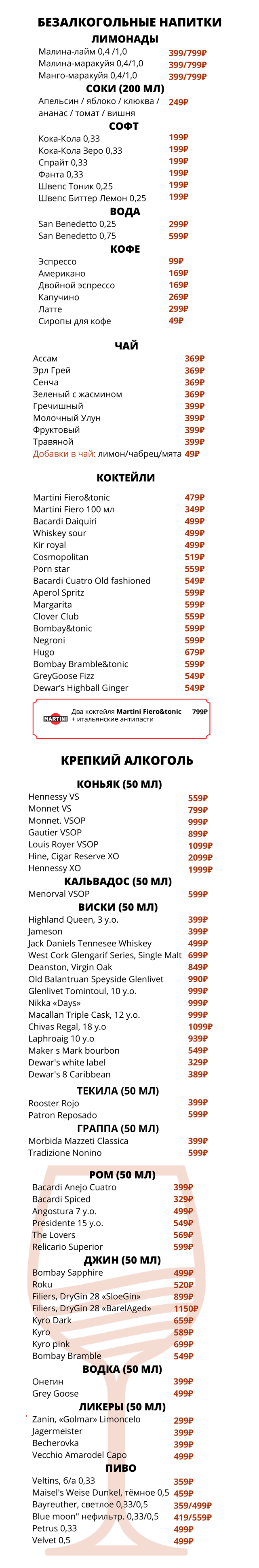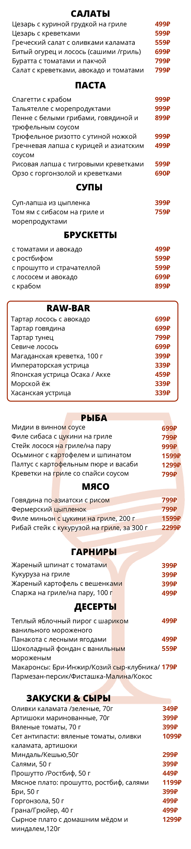 Приведённые цены, ассортимент и состав блюд носят исключительно ознакомительный характер и не являются публичной офертой. Актуальную информацию можно уточнить в баре. Заказывая блюда, предупреждайте официанта об аллергии на определенные продукты. Потребление сырых мяса, рыбы, морепродуктов или моллюсков может увеличить риск болезней пищевого происхождения, особенно у людей с определенными заболеваниями (например, сахарным диабетом, заболеваниями печени, ослабленной иммунной системой). Необходима консультация с врачом, так как это может подвергнуть Вас риску серьезного заболевания. Употребление сырых морепродуктов - это Ваш собственный риск.