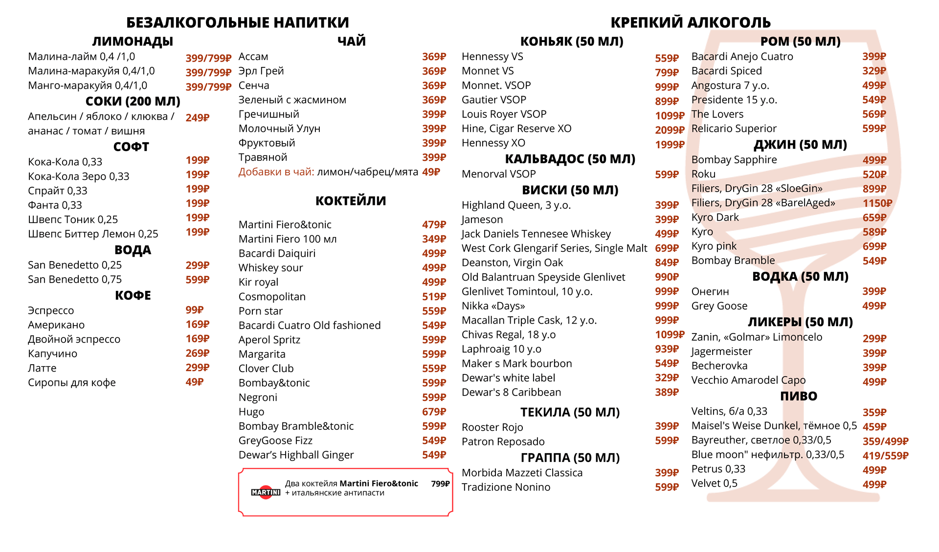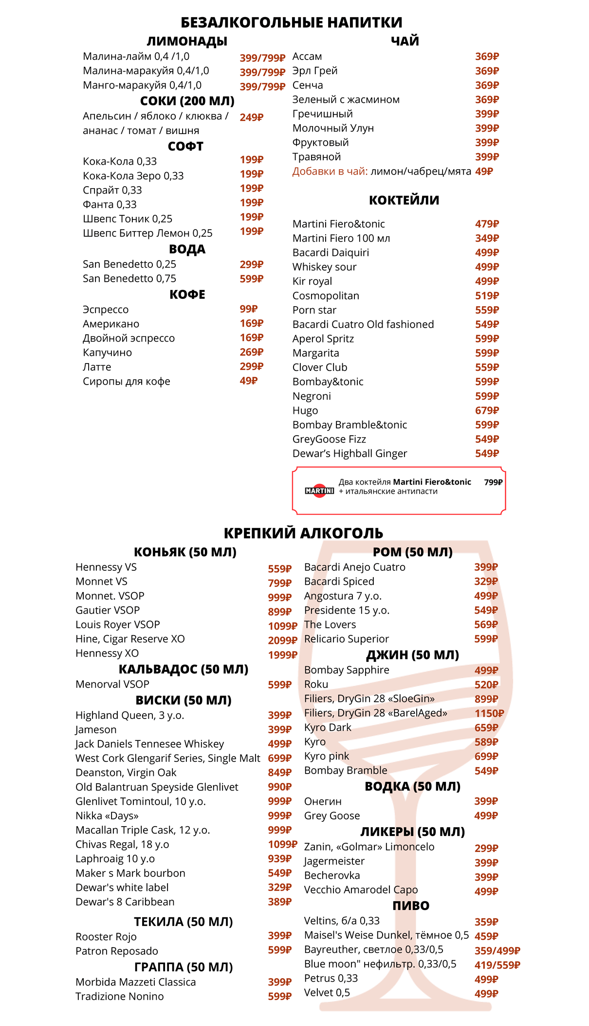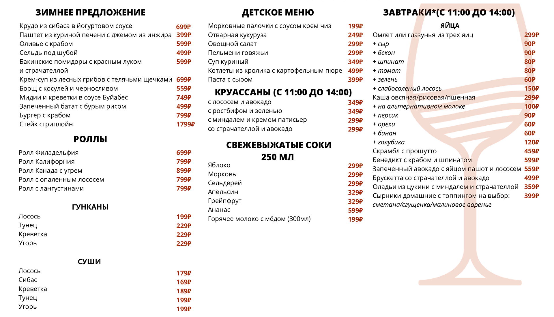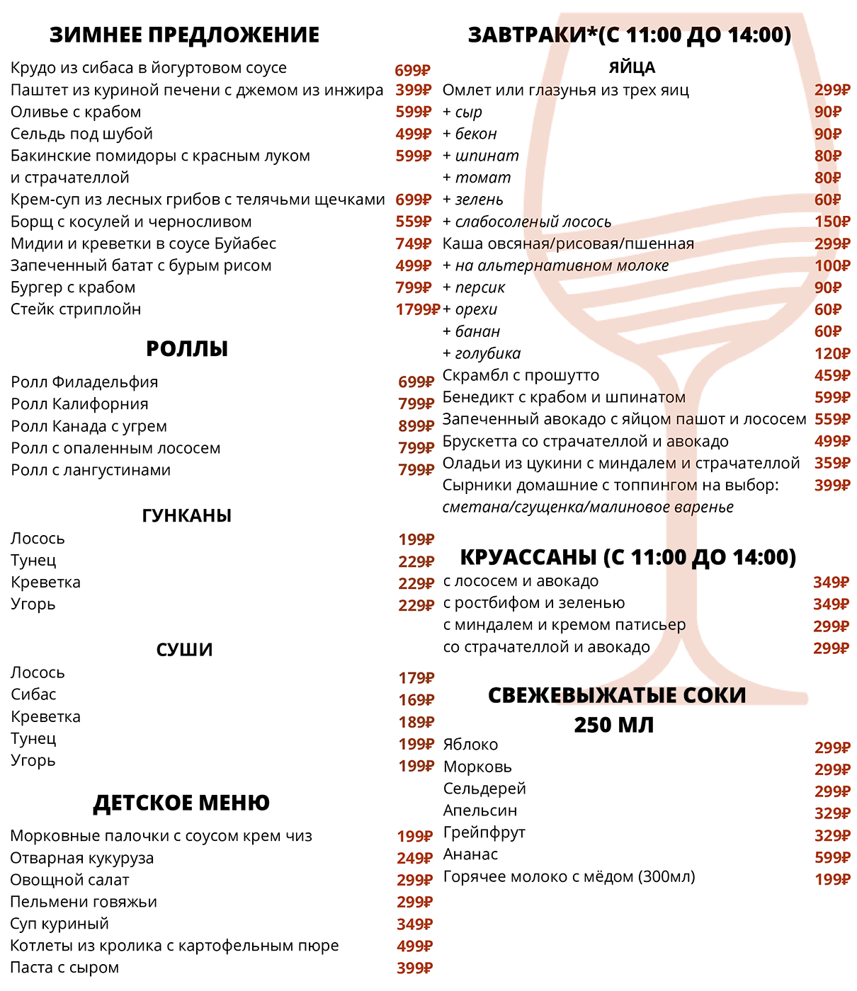 Приведённые цены, ассортимент и состав блюд носят исключительно ознакомительный характер и не являются публичной офертой. Актуальную информацию можно уточнить в баре. Заказывая блюда, предупреждайте официанта об аллергии на определенные продукты. Потребление сырых мяса, рыбы, морепродуктов или моллюсков может увеличить риск болезней пищевого происхождения, особенно у людей с определенными заболеваниями (например, сахарным диабетом, заболеваниями печени, ослабленной иммунной системой). Необходима консультация с врачом, так как это может подвергнуть Вас риску серьезного заболевания. Употребление сырых морепродуктов - это Ваш собственный риск.